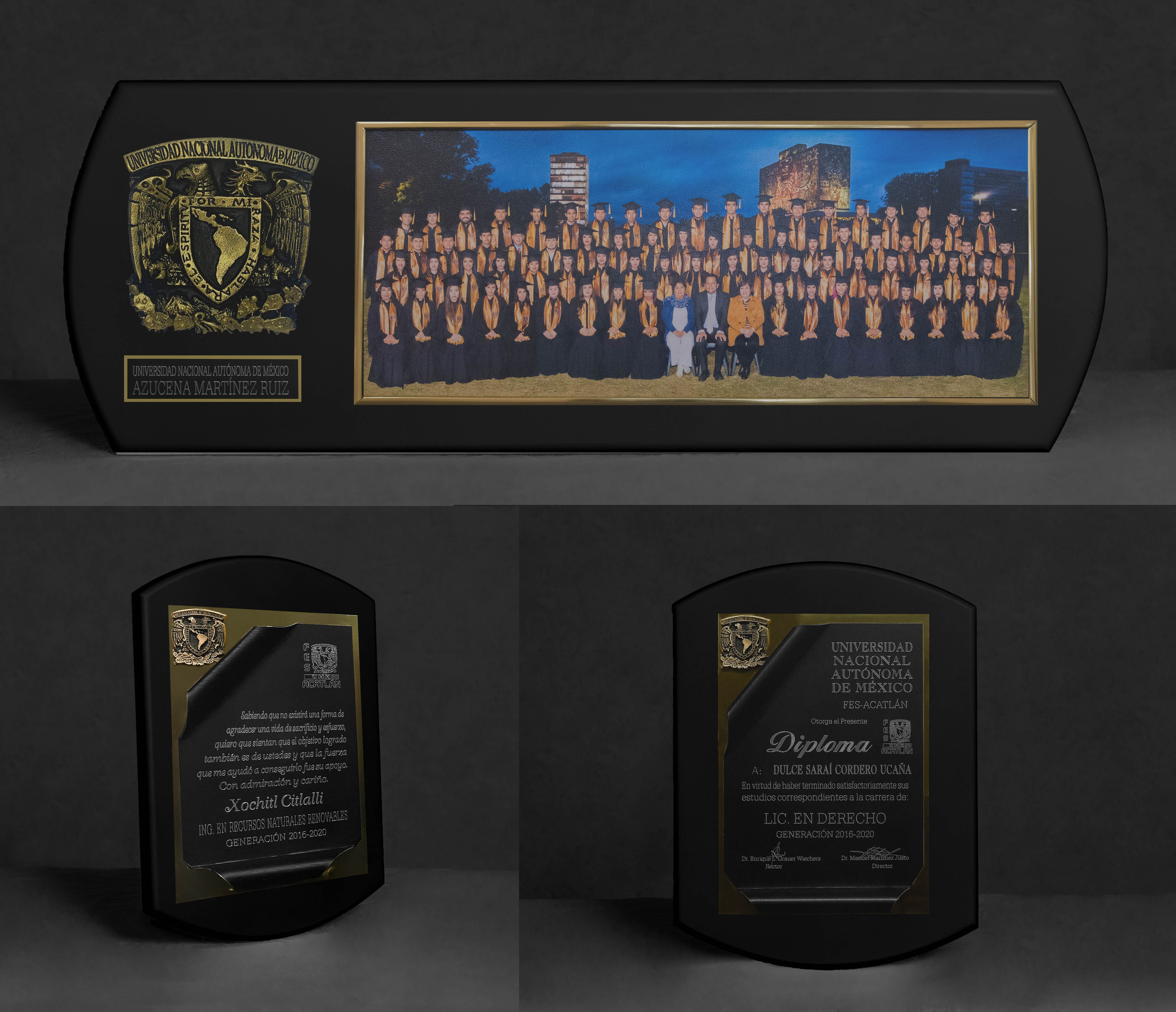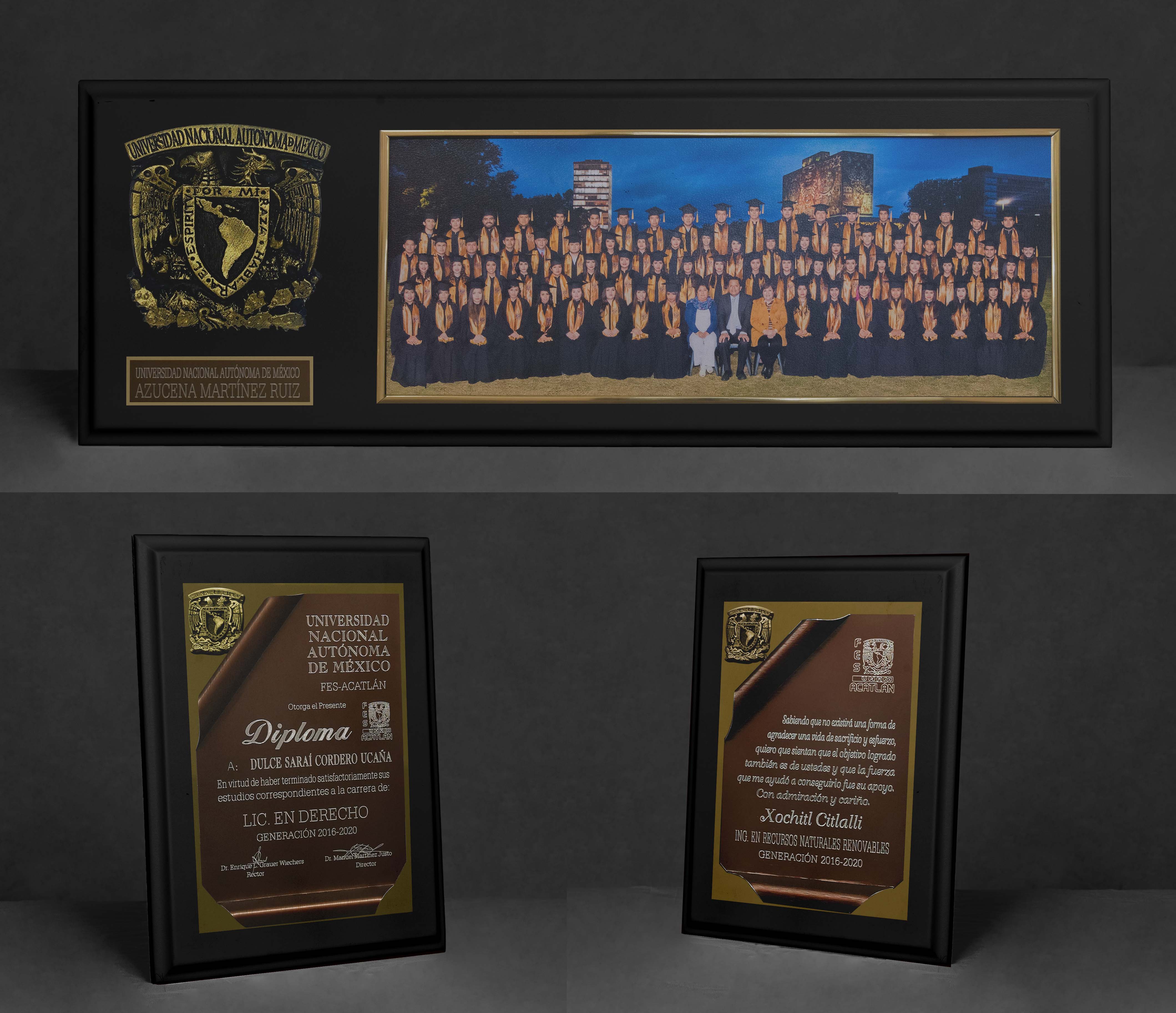 Bases fabricadas en madera de forma rectangular, contiene placas de aluminio grabadas en punta de diamante y escudo metálico en diploma y agradecimiento. La fotografía tiene una escultura de resina.