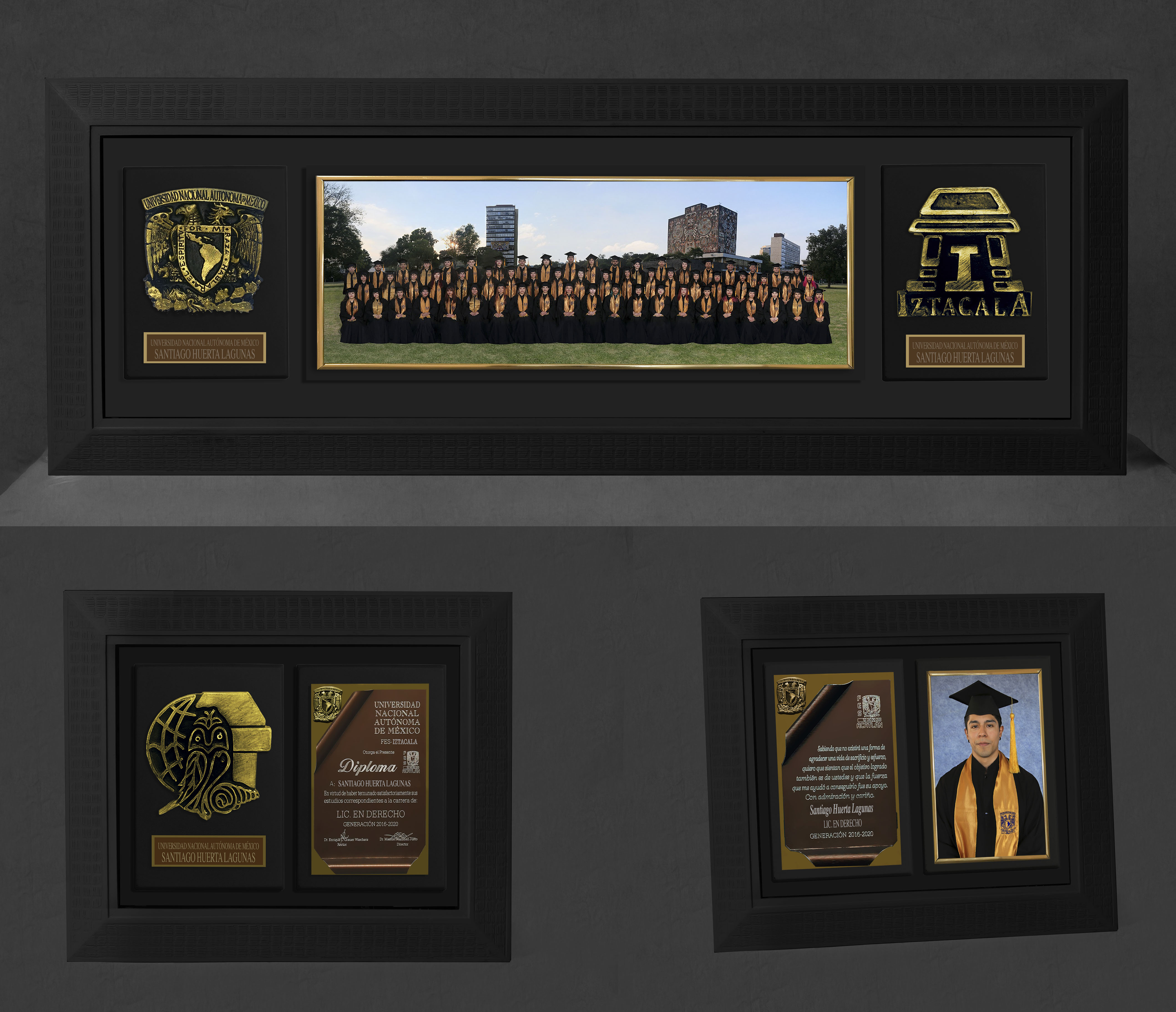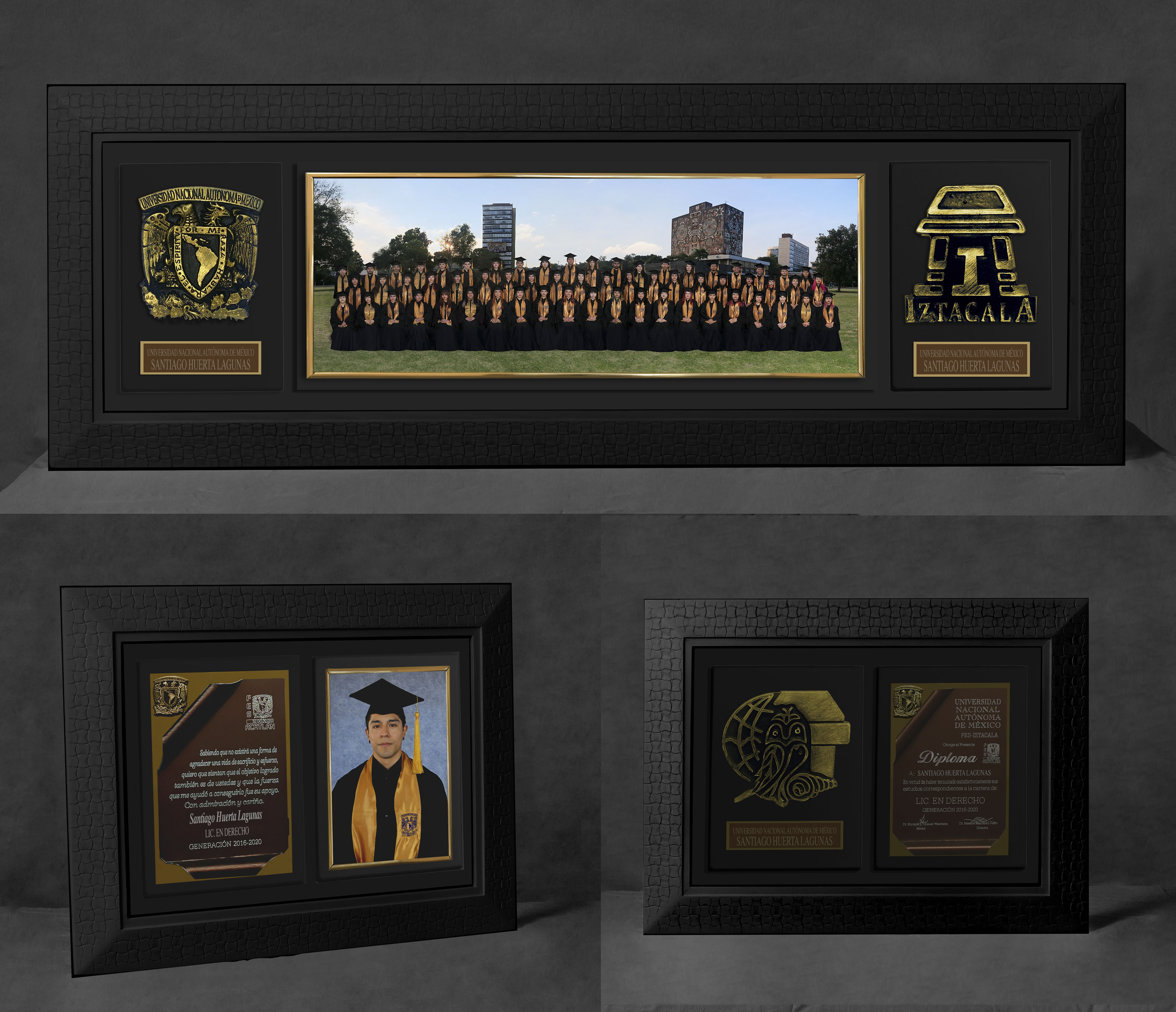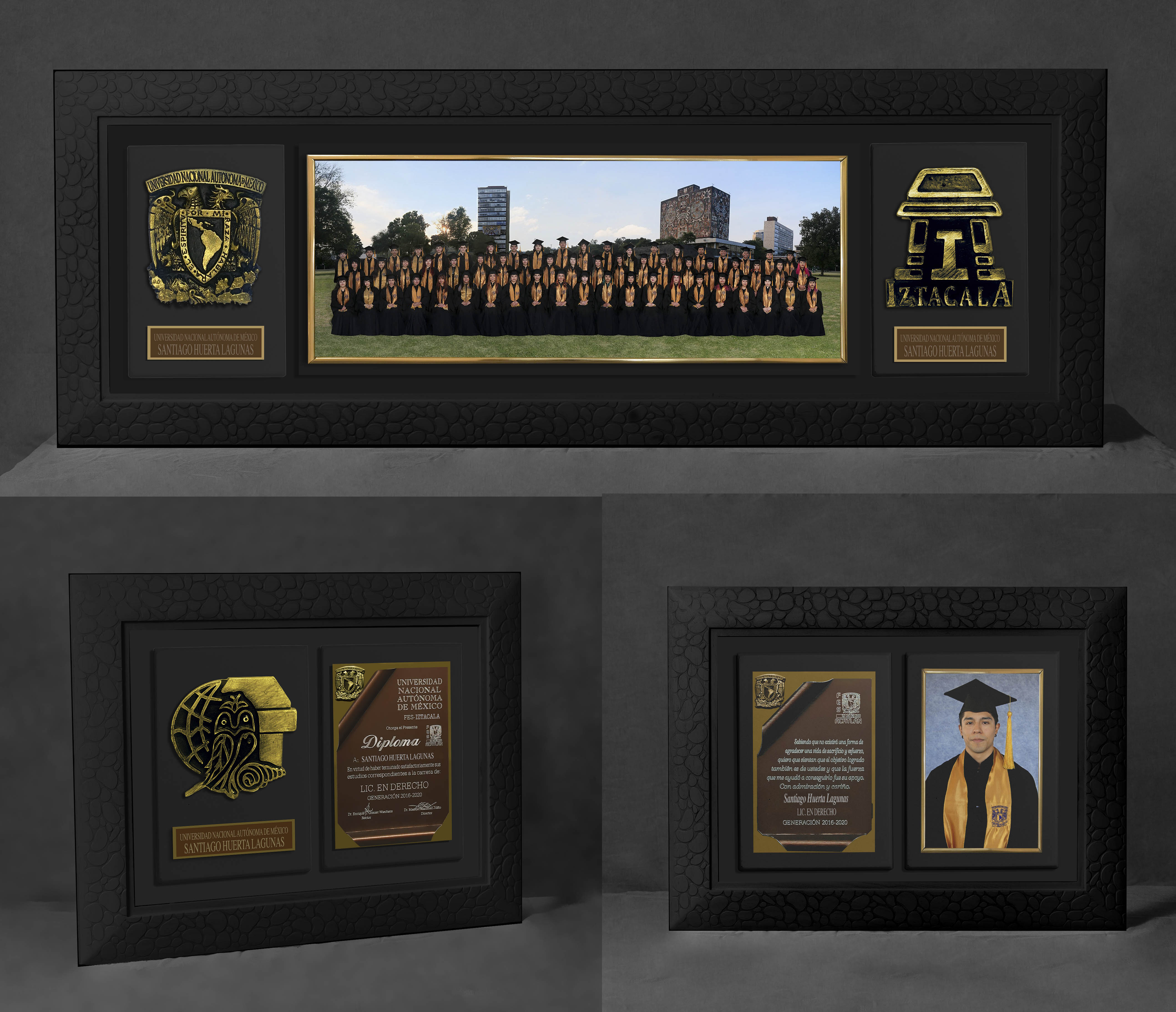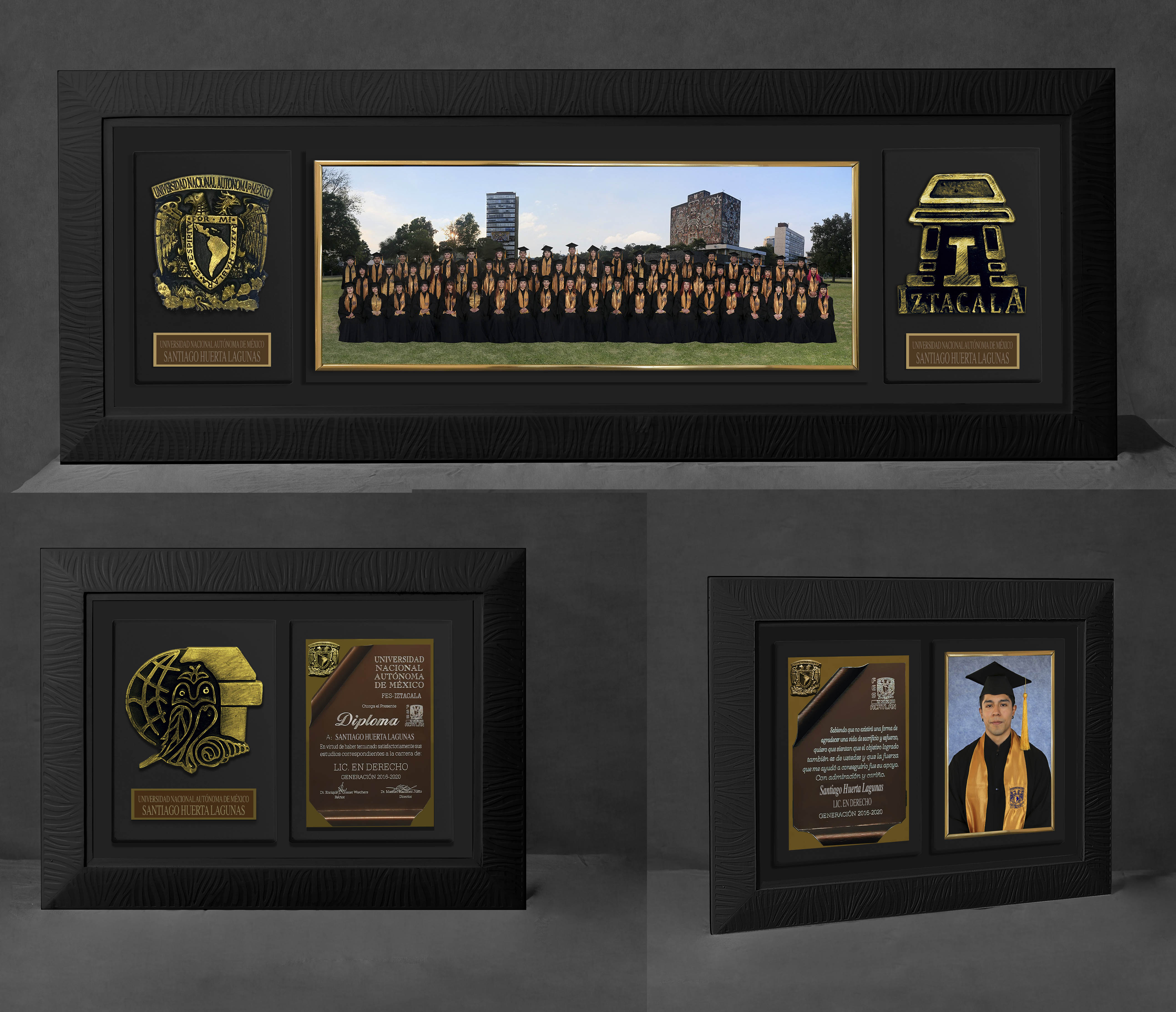 Bases fabricadas con moldura de madera en diferentes diseños, contiene placas de aluminio grabadas en punta de diamante y escudo metálico en diploma y agradecimiento, cada uno tiene dos bases flotantes, uno para placa y otro para foto individual o escultura de resina. La fotografía tiene dos esculturas de resina,sobre bases flotantes de madera.