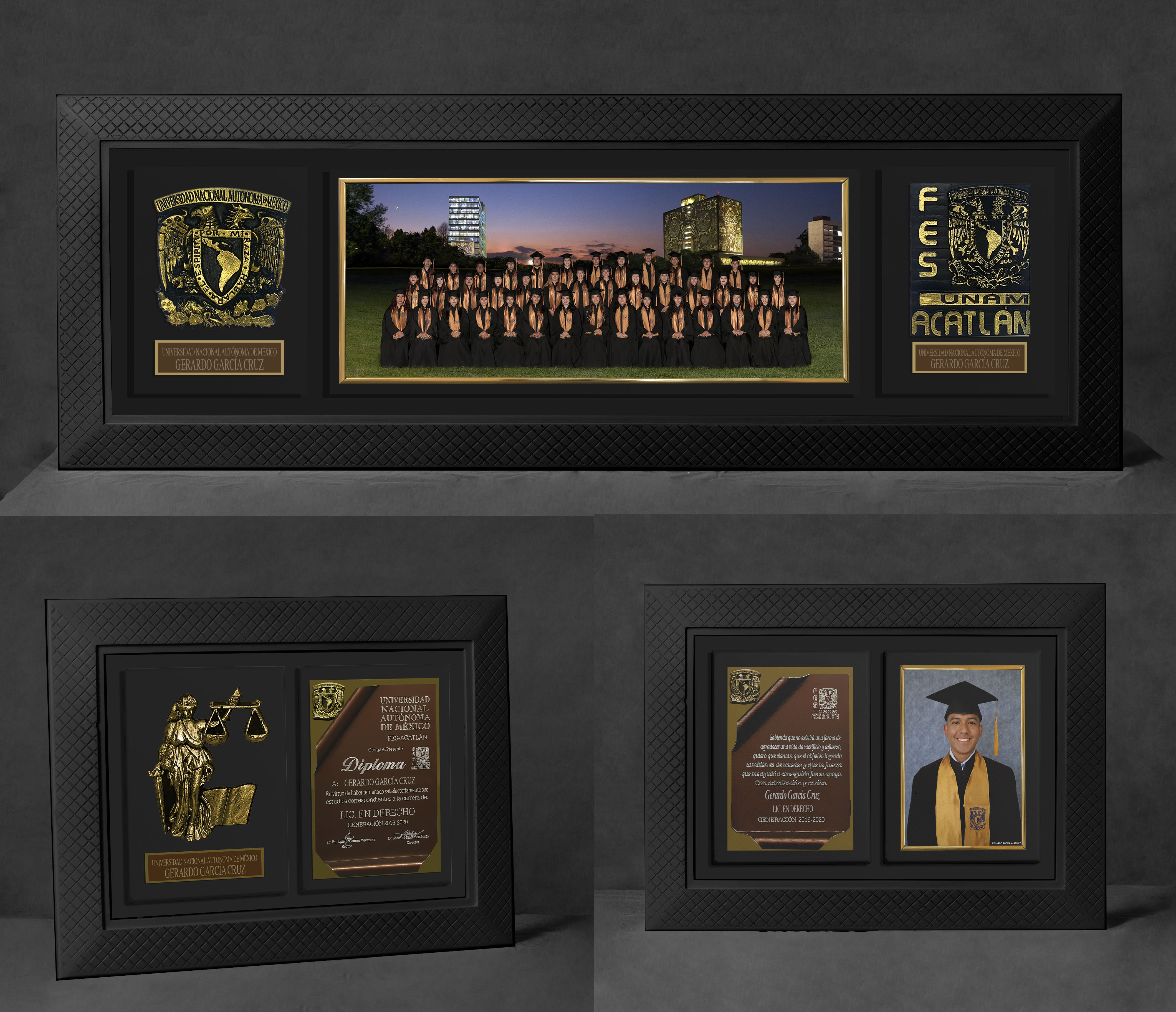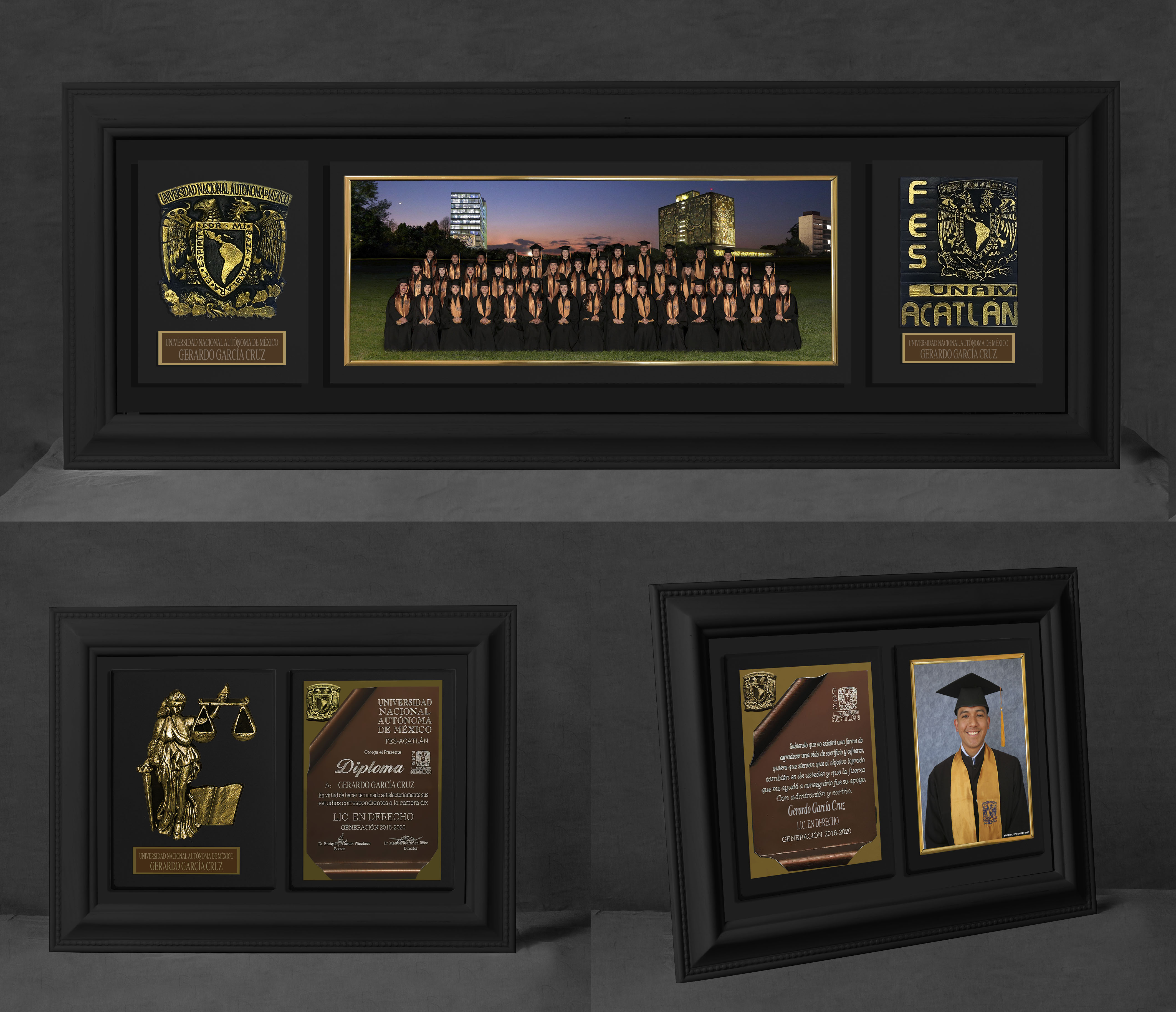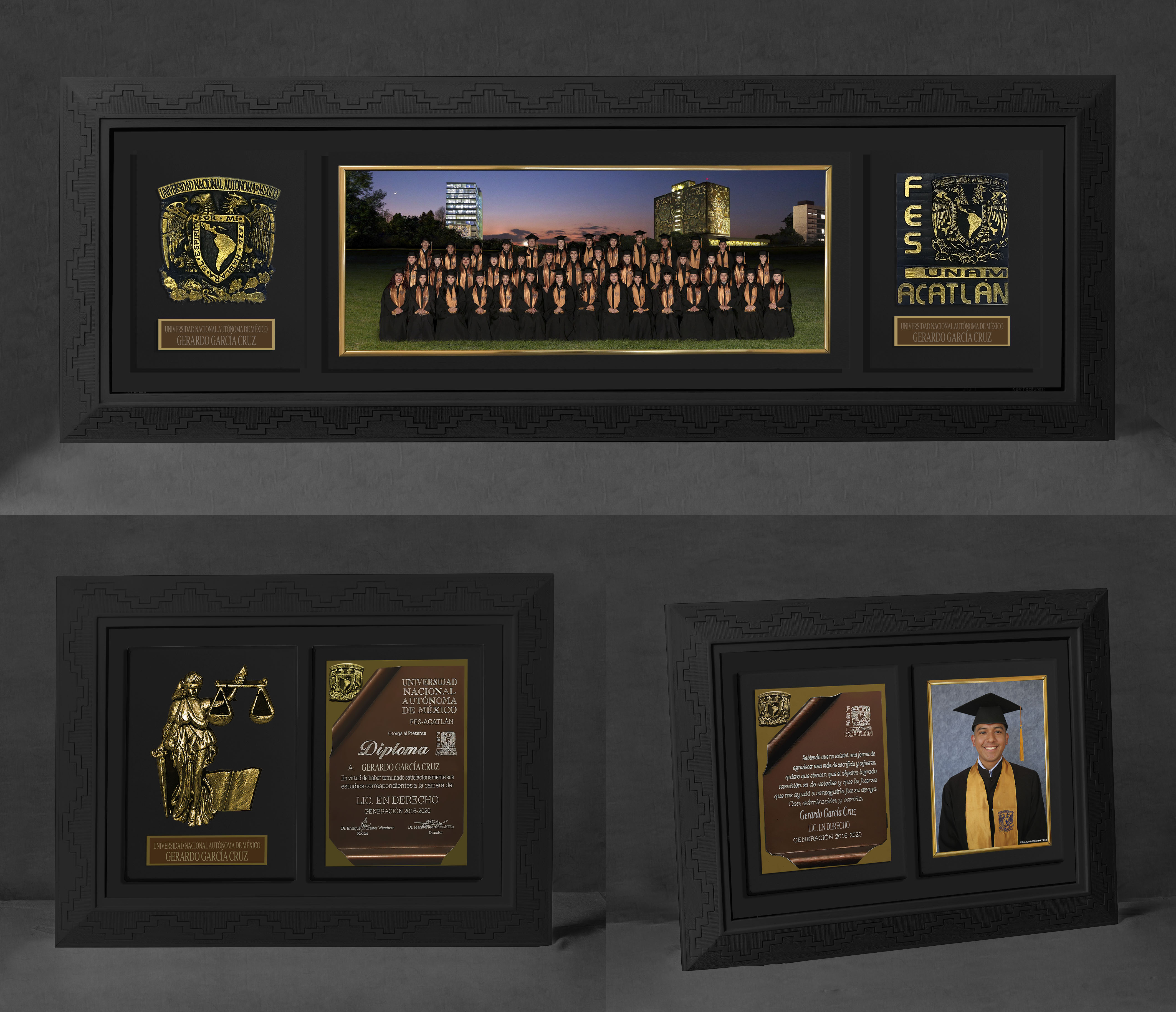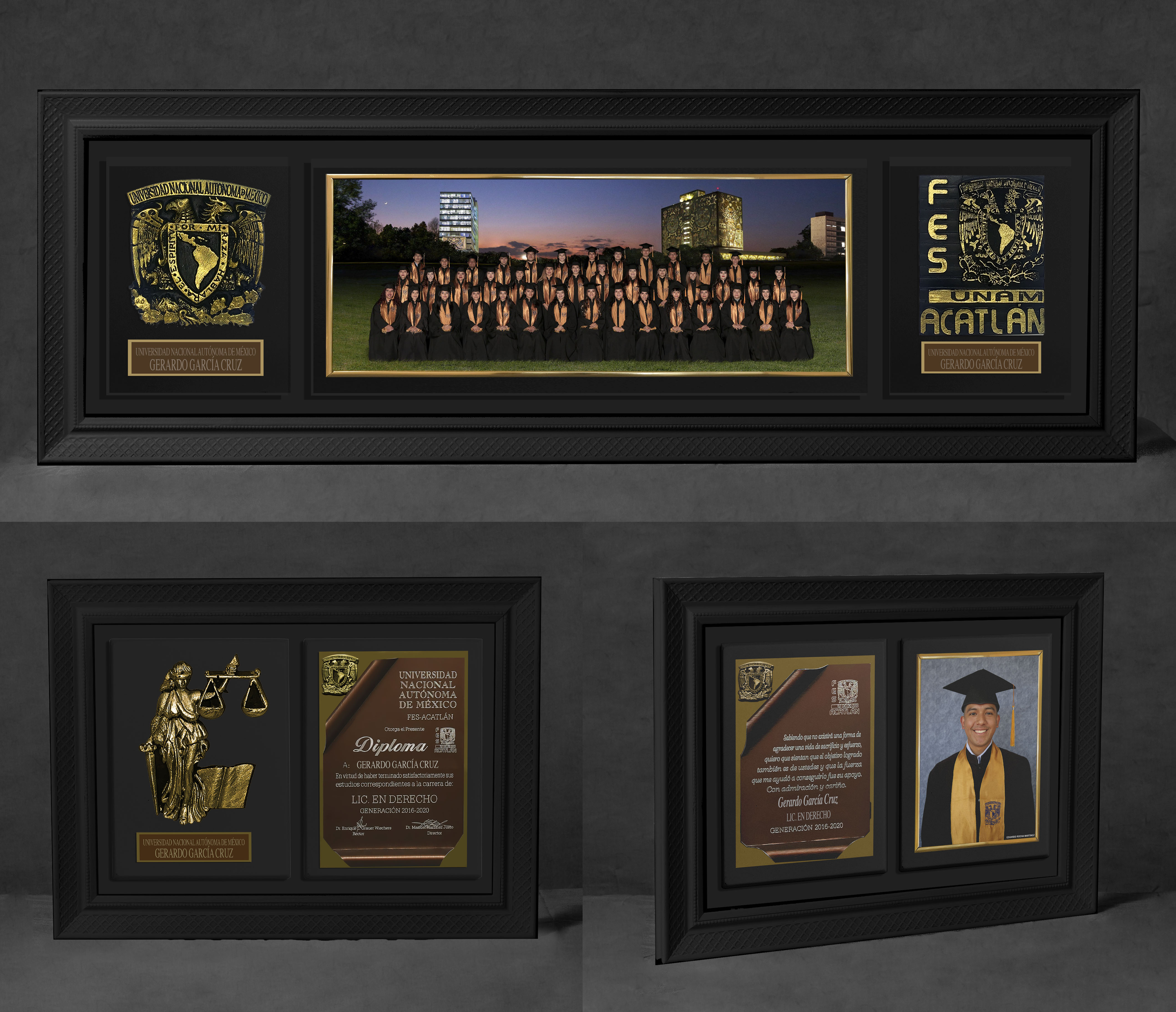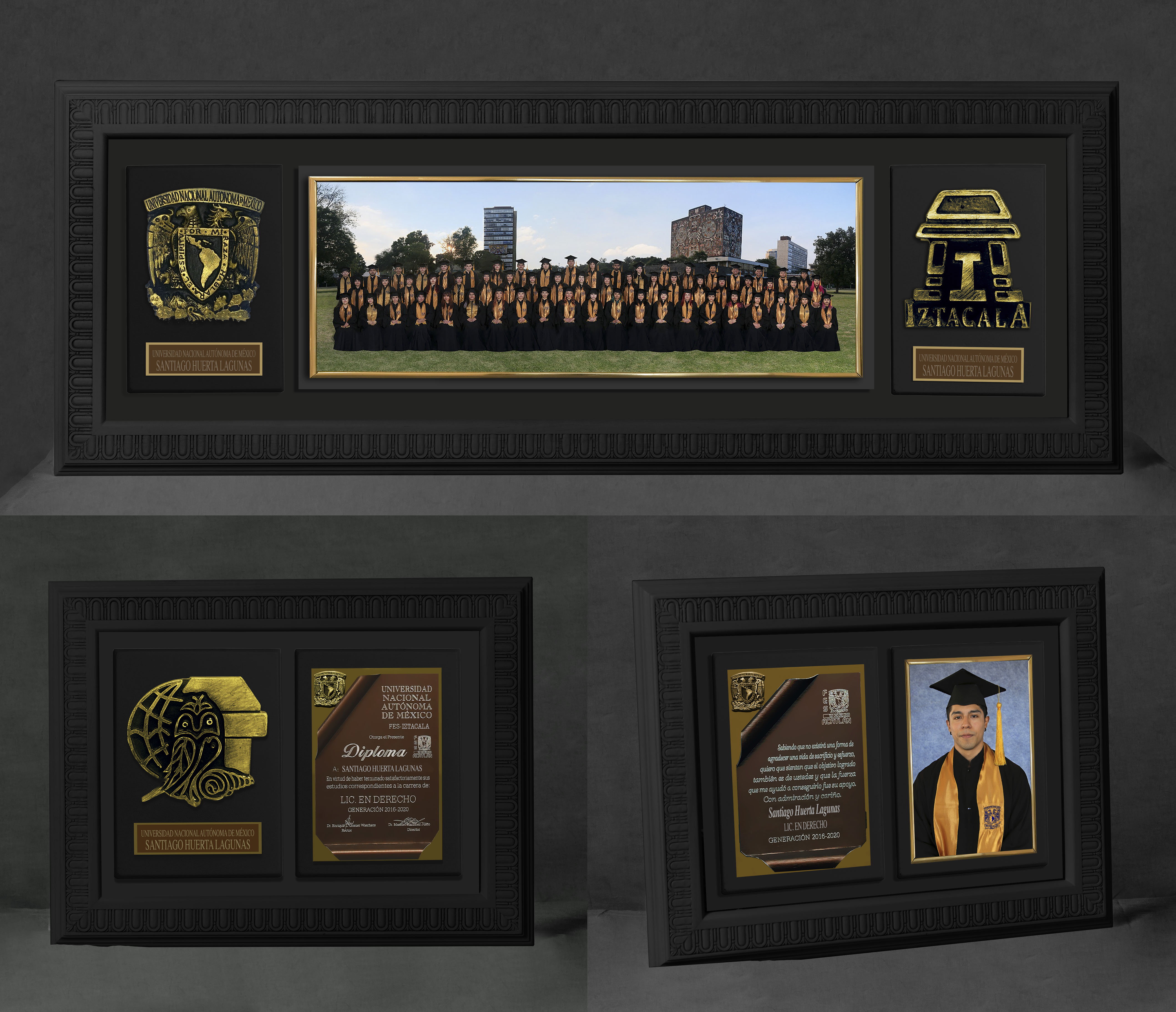 Bases fabricadas con moldura de madera en diferentes diseños, contiene placas de aluminio grabadas en punta de diamante y escudo metálico en diploma y agradecimiento, cada uno tiene dos bases flotantes, uno para placa y otro para foto individual o escultura de resina. La fotografía tiene dos esculturas de resina,sobre bases flotantes de madera.