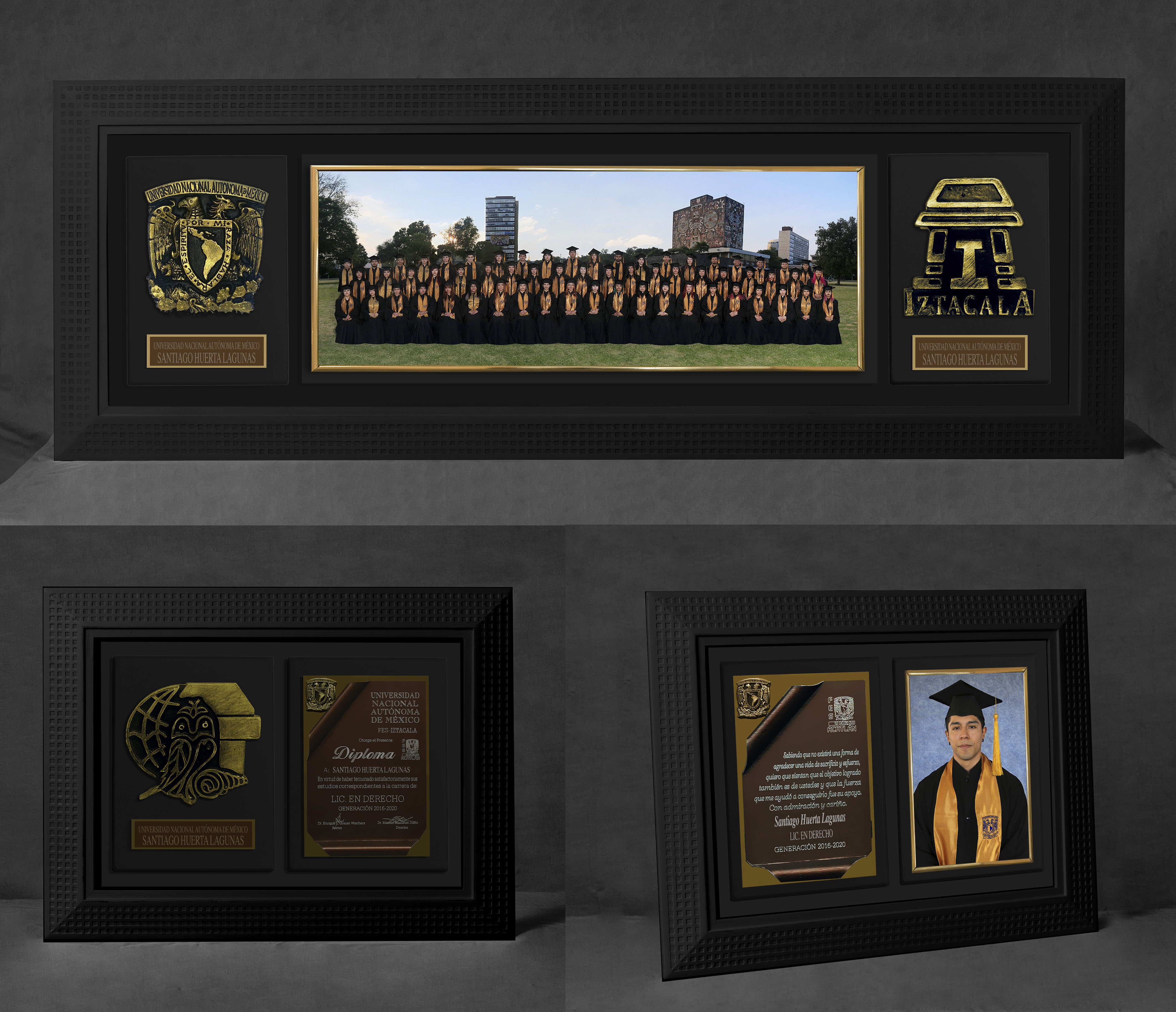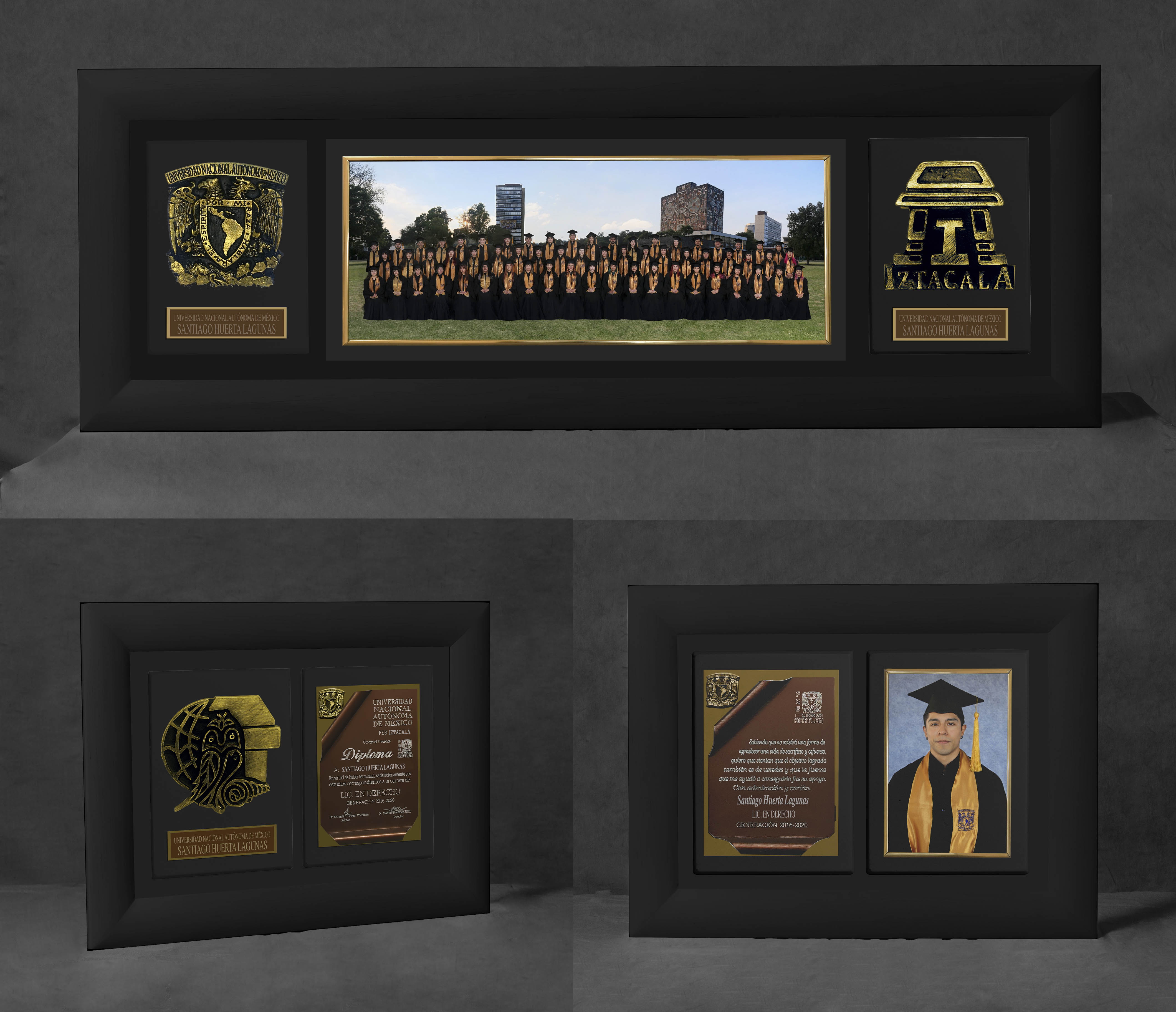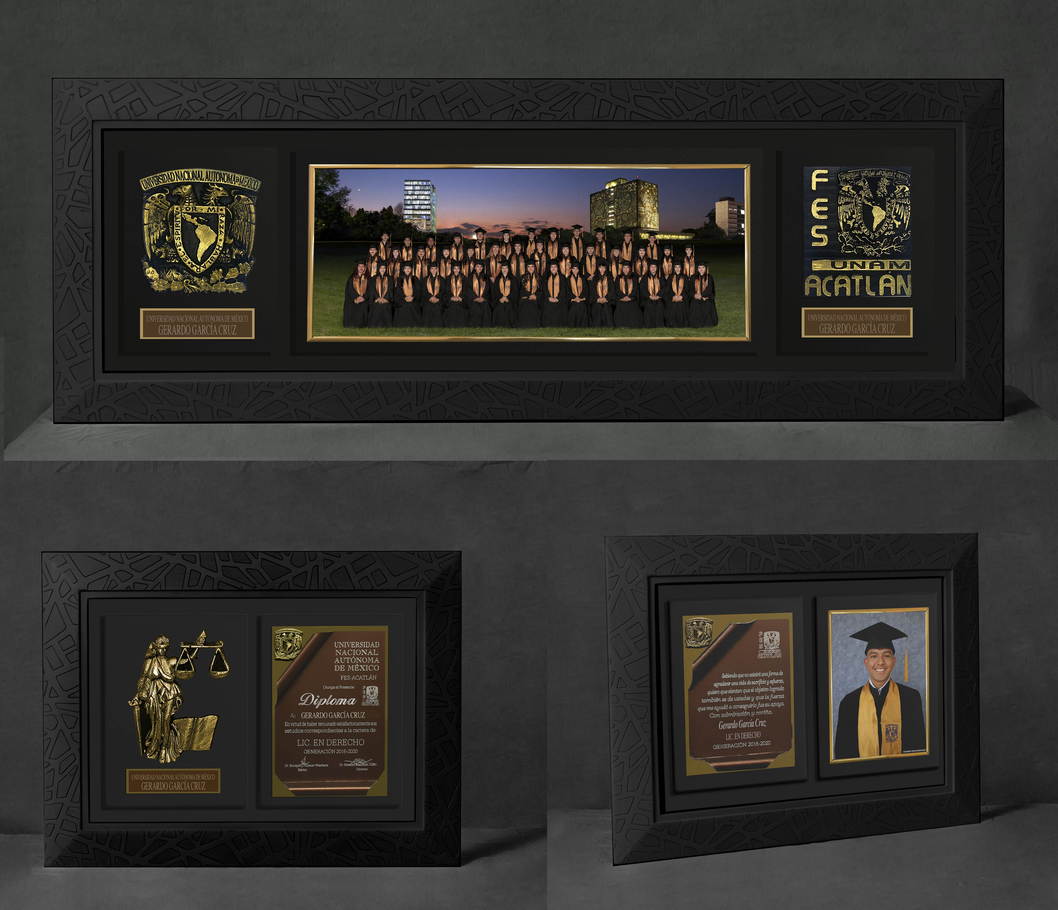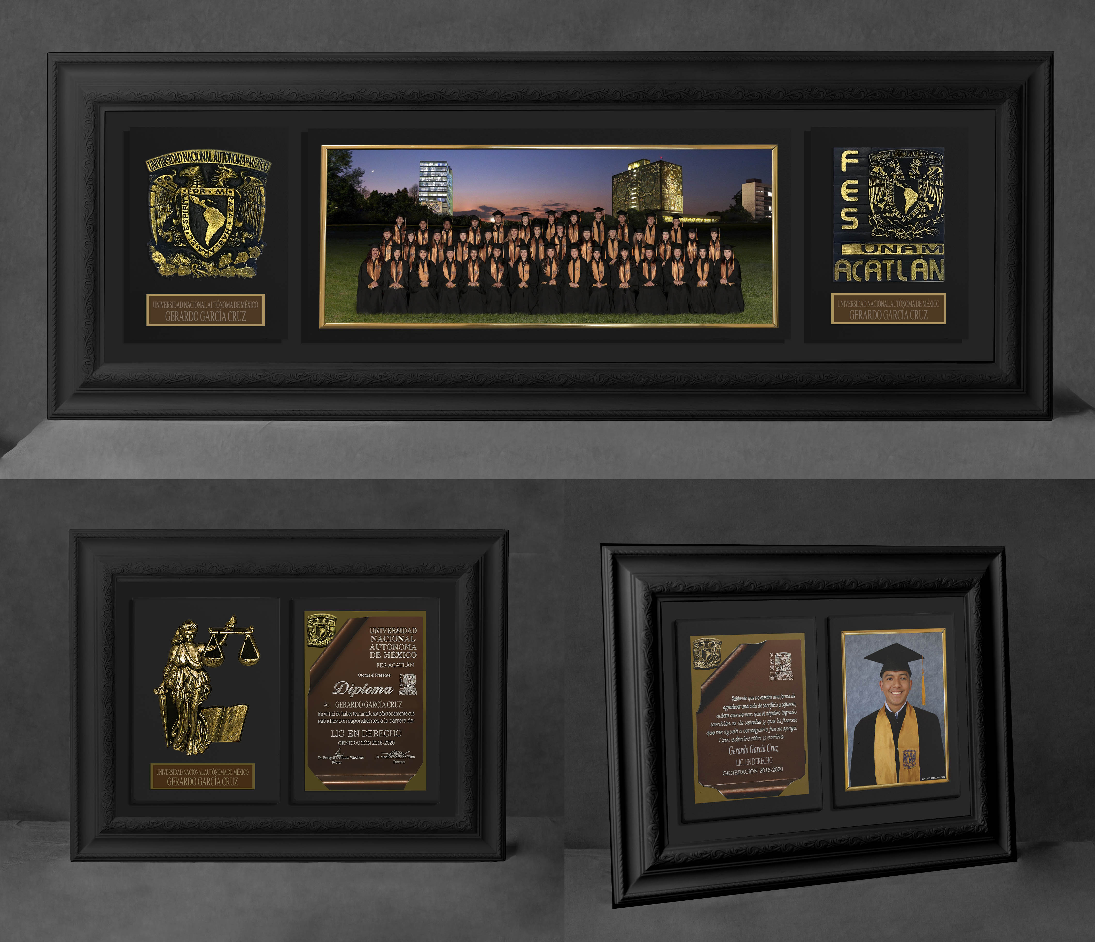 Bases fabricadas con moldura de madera en diferentes diseños, contiene placas de aluminio grabadas en punta de diamante y escudo metálico en diploma y agradecimiento, cada uno tiene dos bases flotantes, uno para placa y otro para foto individual o escultura de resina. La fotografía tiene dos esculturas de resina,sobre bases flotantes de madera.