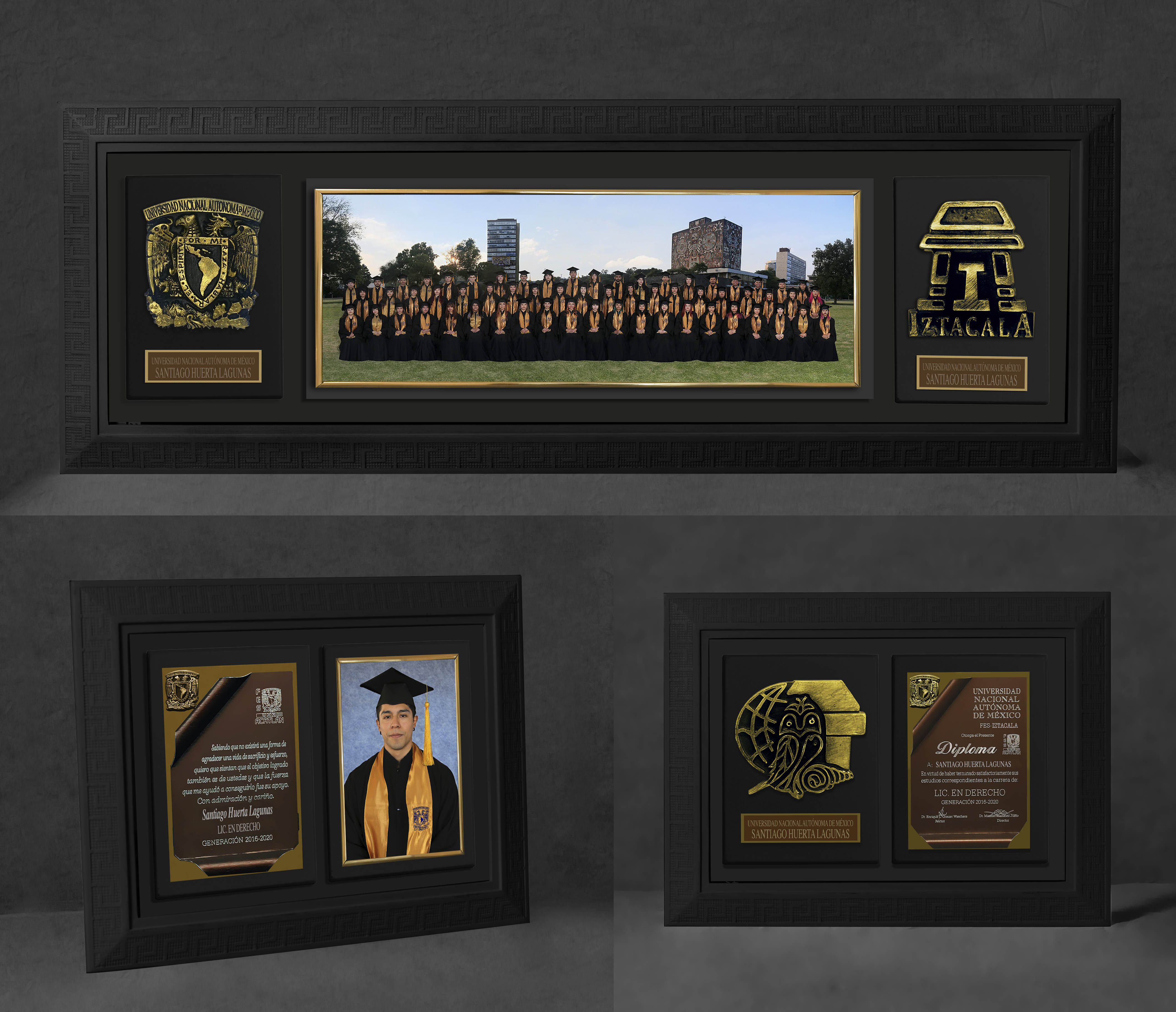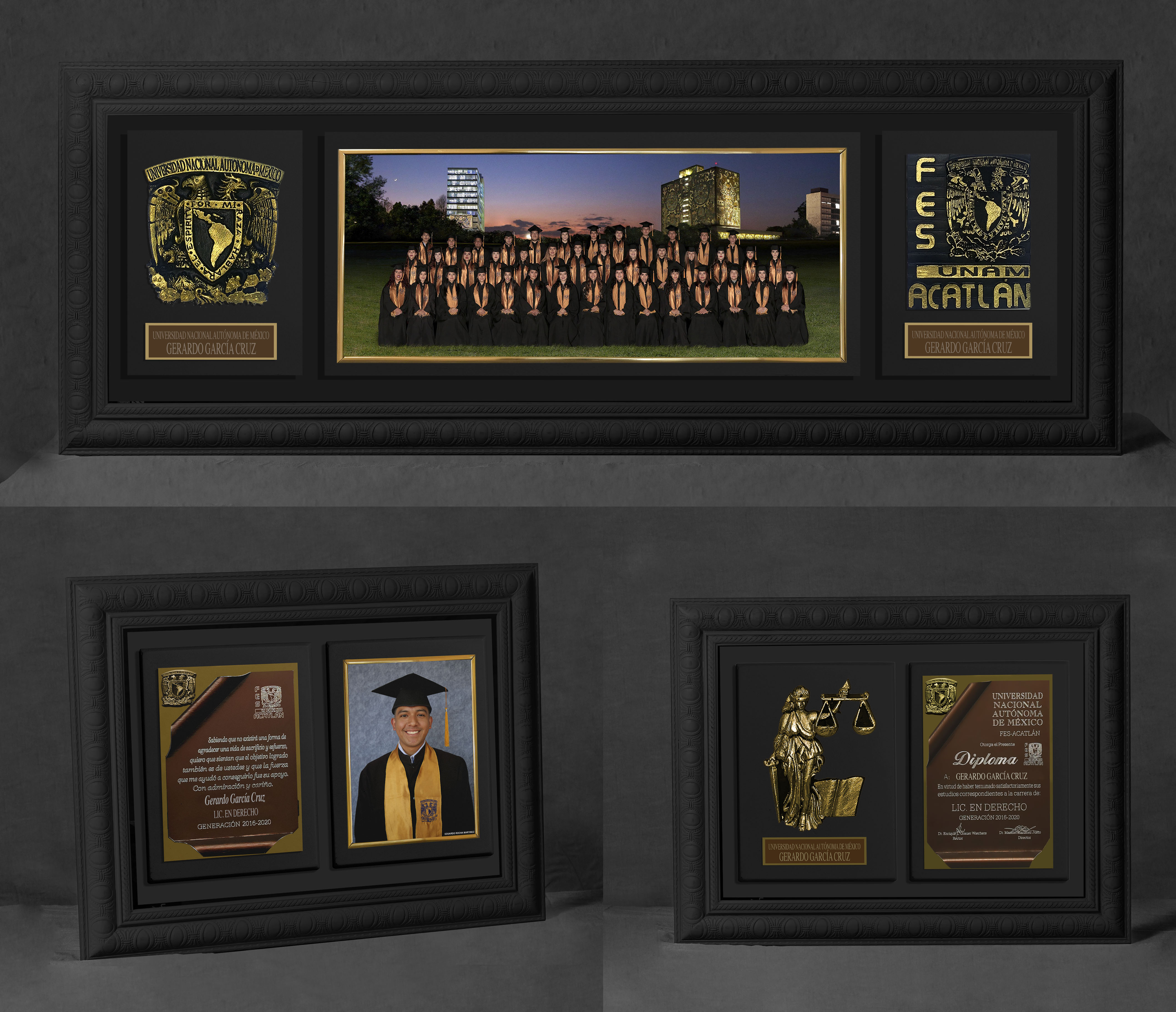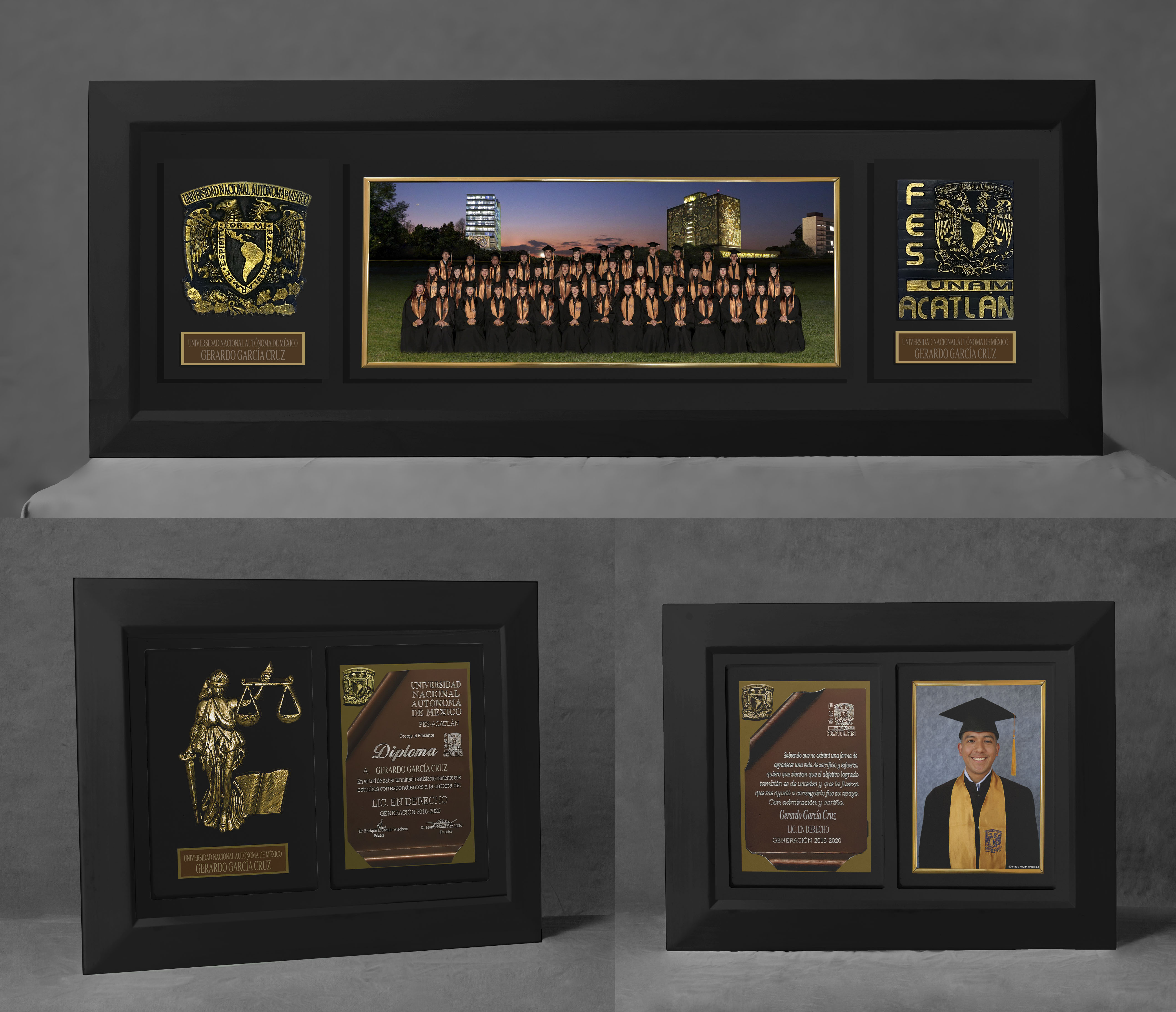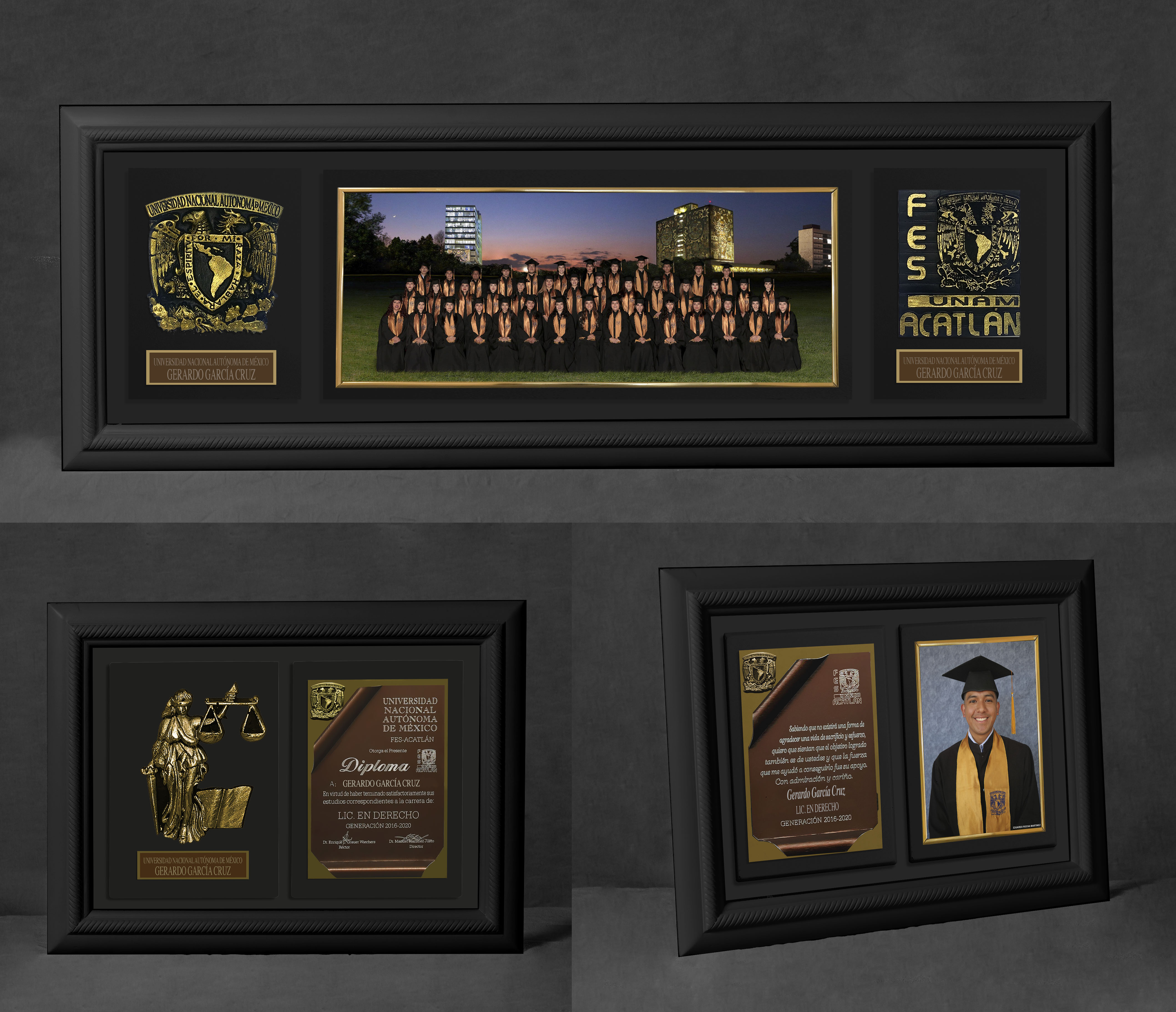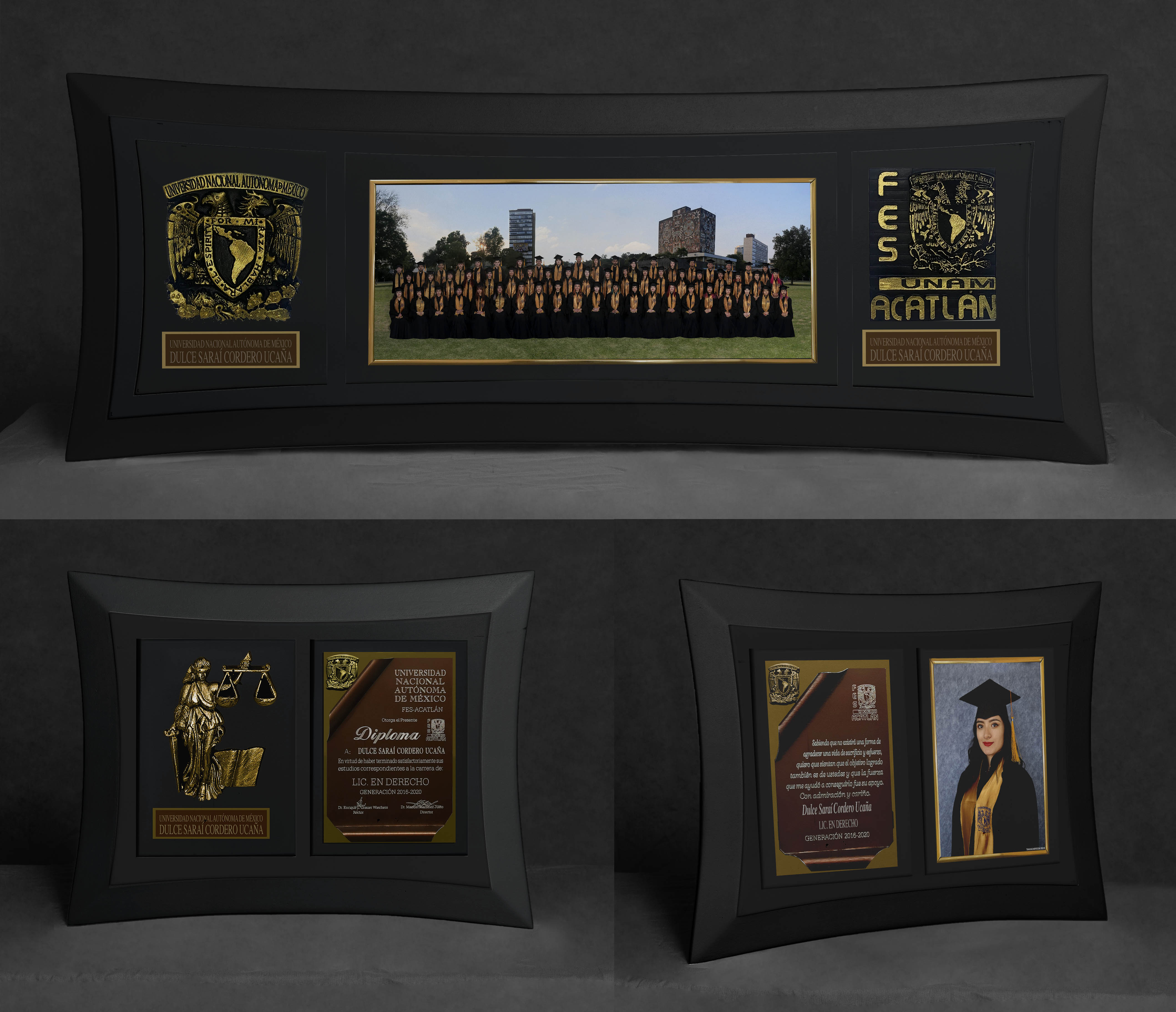 Bases fabricadas con moldura de madera en diferentes diseños, contiene placas de aluminio grabadas en punta de diamante y escudo metálico en diploma y agradecimiento, cada uno tiene dos bases flotantes, uno para placa y otro para foto individual o escultura de resina. La fotografía tiene dos esculturas de resina,sobre bases flotantes de madera.