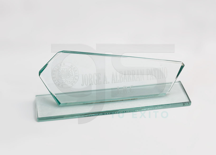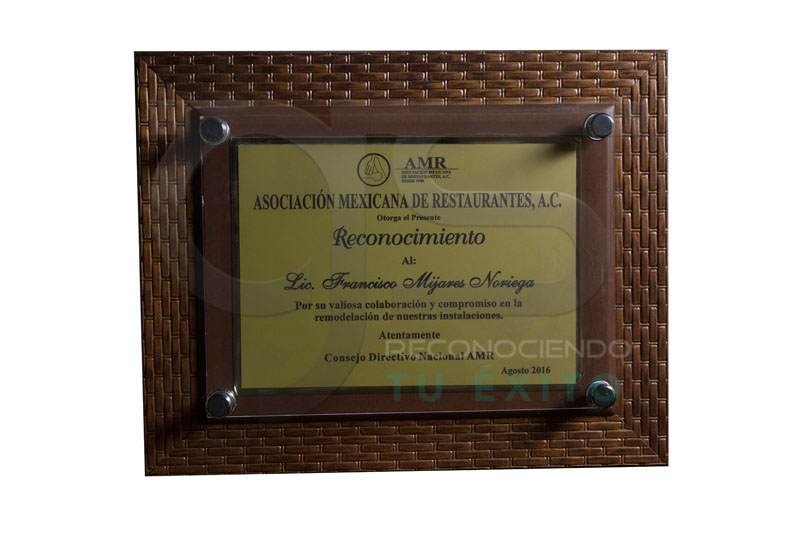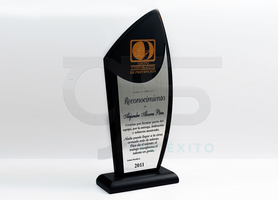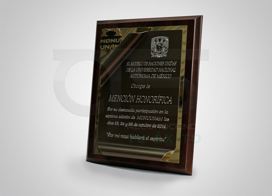 Base Madera o MDF en diferentes colores, con placa grabada en punta diamante y fondo plateado y aplicación (logo) en zamak.